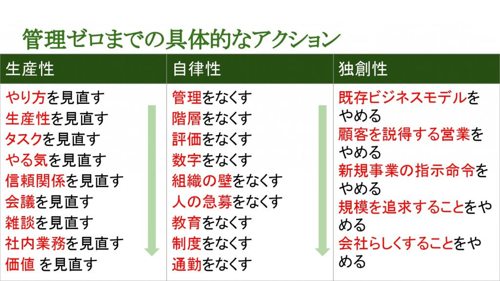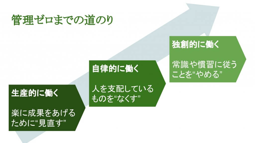 「管理ゼロにしましょう!」とは書いてない。「マネジメントの本質について考えましょう」と書いてある。マネジメントを突き詰めることで結果として管理ゼロでも大丈夫になるのです。では、そのために何をするのか?