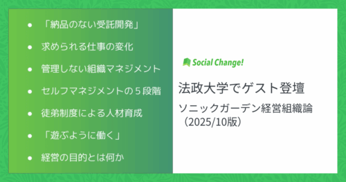 先日、毎年恒例になっていますが、法政大学にて経営学の授業でゲスト講師として登壇してきました。今回の参加者は、社会人のコースでした。 経営学の観点からの組織運営の歴史や変化の文脈から、私はソニックガ…